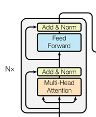 Encoder 。Transformer的编码器结构如图2-5。可以看到,Encoder部分由N个Encoder单元构成。在Transformer中,N=6。一个Encoder单元,由一个多头注意力机制(Multi-Head Attention)和一个前馈网络(Feed Forward)构成。在多头注意力机制和前馈网络完成后,会计算残差和(Add)并正规化(Norm)。首先,我们来讨论多头注意力机制。