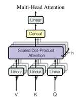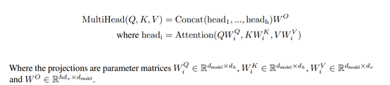 多头注意力机制如图2-6。Transformer认为,将模型分为多个头,形成多个子空间,可以让模型去关注不同方面的信息。多头注意力机制就是将缩放点积注意力机制的过程做h次,再把输出合并起来。多头注意力机制的公式如下: