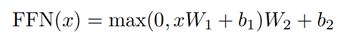 Encoder单元中的另一个部分是一个前馈网络。Transformer在这里设计的前馈网络比较简单,为一个两层的多层感知机,第一层有一个ReLU激活函数,第二层为一个线性变换。公式如下: