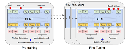接下来我们来介绍BERT中另外一个部分,Next Sentence Prediction。很多下游任务,比如问题回答、自然语言推理等,都要基于多个句子之间的关系,这个关系是没有办法被语言模型直接捕获到的。为了解决这个问题,BERT在预训练中加入了NSP。NSP是一个二分类下句预测任务。具体地,对于每个样本来说都是由A和B两句话构成,其中的情况B确实为A的下一句话(标签为IsNext),另外的的情况是B为语料中其它的随机句子(标签为NotNext),然后模型来预测B是否为A的下一句话。NSP的位置在BERT模型图中有所体现。