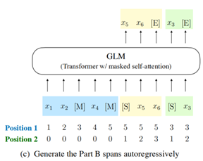 在这里也可以看出,GLM预测的条件比BERT多了一个partB。在BERT中,MASK掉的15%的输入,其中只有80%被[MASK]替代,而另外10%不变,10%随机变为其他Token,BERT通过这种方式来保留一些被Masked的原始信息。但是GLM没有这样做,GLM把Masked掉的信息全部保留在了partB,这样可以进一步提高预测能力。不过partA是看不到partB的,partB可以自回归地看到已经走过的partB和全部的partA。