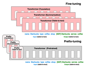 x为输入,y为输出。Prefix-Tuning将预训练LM参数固定,Prefix参数进行微调,它不仅只在Embedding层进行微调,而是在每一层都进行微调。