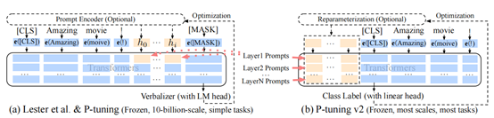 Prompt-Tuning和P-Tuning v2基本上是同一时期发布的,它们均基于Prefix-Tuning进行了修改和优化,结构基本一致。这里,我们选择P-Tuning v2进行介绍。